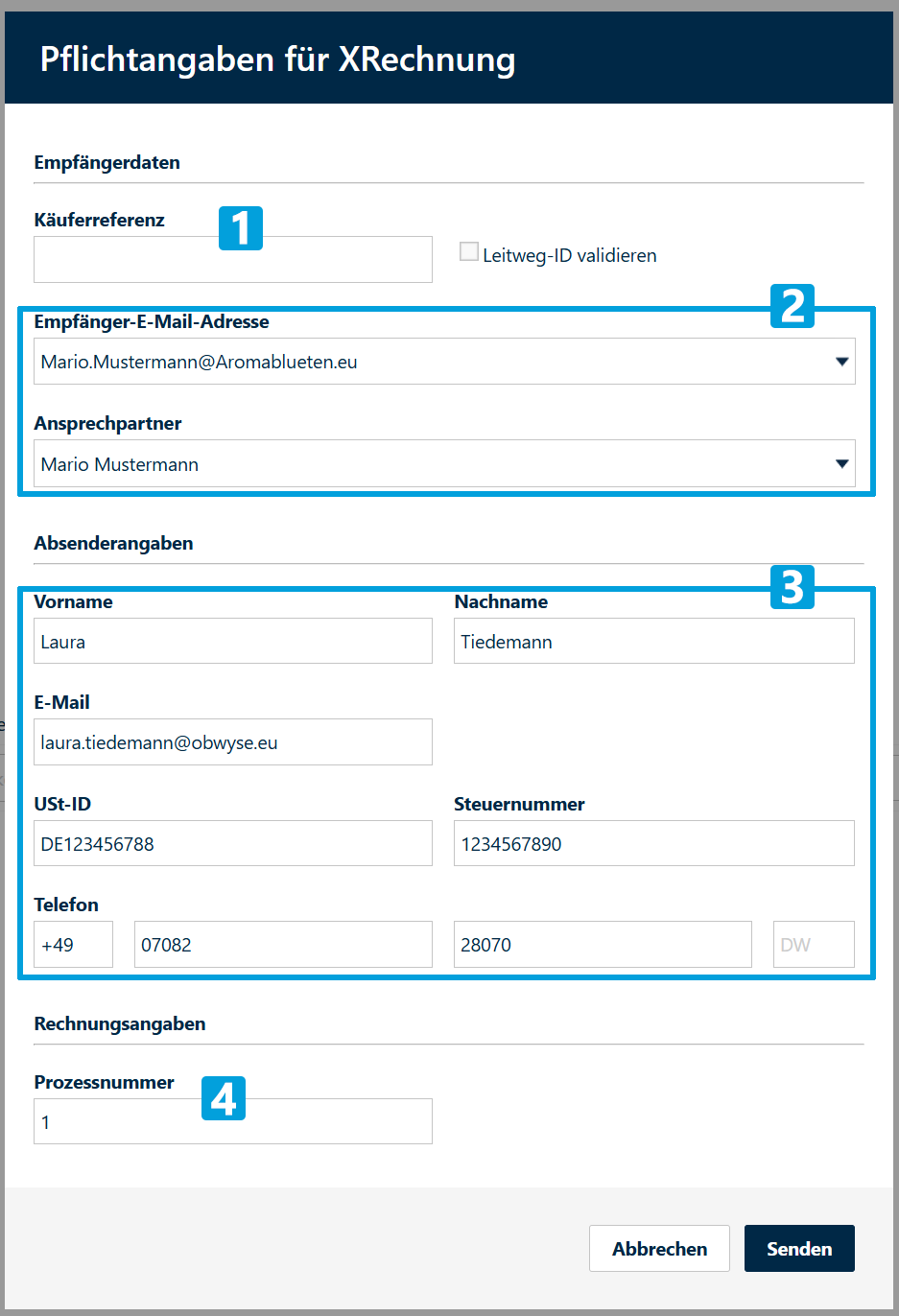XRechnung: öffnet ein Popup, in welchem Empfänger- und Absenderangaben eingetragen bzw. überprüft werden müssen.