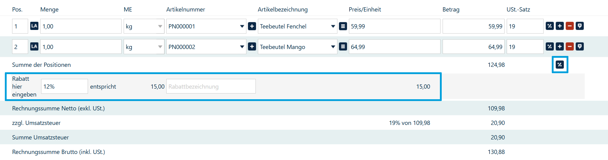 Nachdem ein Artikel erfasst wurde, werden unterhalb der Positionszeile die „Summe der Positionen“ (ggfs. inkl. Rabatt), die „Rechnungssumme Netto“ exklusive Umsatzsteuer, die „zuzügliche Umsatzsteuer“ aufgeschlüsselt nach dem Umsatzsteuersatz, die „Summe der Umsatzsteuer“, sowie die „Rechnungssumme Brutto“, inklusive Umsatzsteuer aufgeschlüsselt.