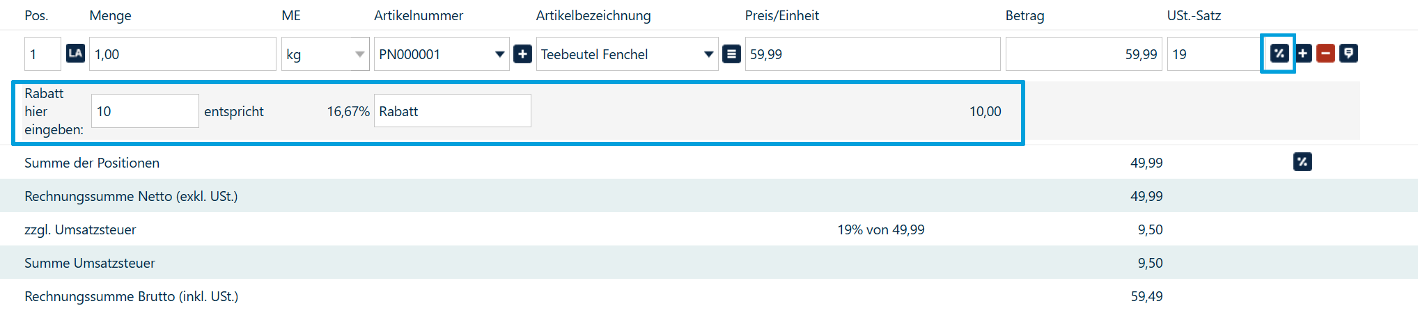 Um Rabatt auf eine Position (Artikel) zu gewährleisten, klicken Sie das Prozent-Icon in der Positionszeile an. Darunter öffnet sich nun eine Eingabemaske. Im ersten Feld können Sie den Betrag des Rabattes eingeben.